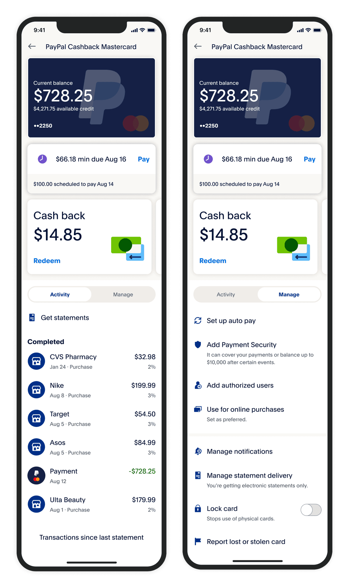 Top card art with balance is matching the other card in PayPal wallet to keep the consistency between the products
